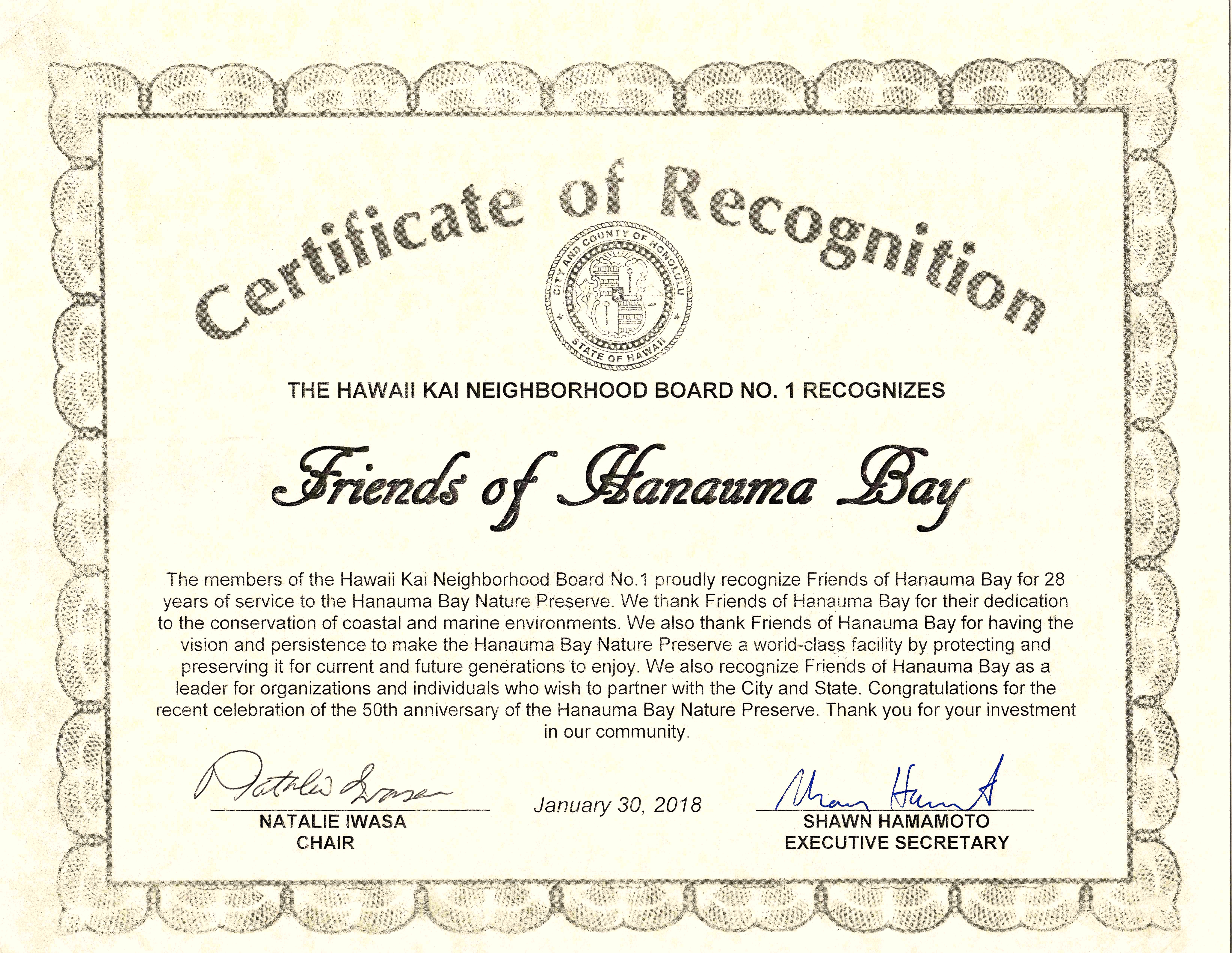 Friends of Hanauma Bay was recently honored with a Certificate of Recognition from the Hawaii Kai NB #1 which proudly recognized friends of Hanauma Bay for 28 years of service to the Hanauma Bay Nature Preserve and as a leader for organizations and individuals who wish to partner with the City and State. Thank you Friends for your service over so many years, and thank you Hawaii Kai Neighborhood Board for encouraging citizen action and unwaveringly supporting our advocacy for the Bay!
