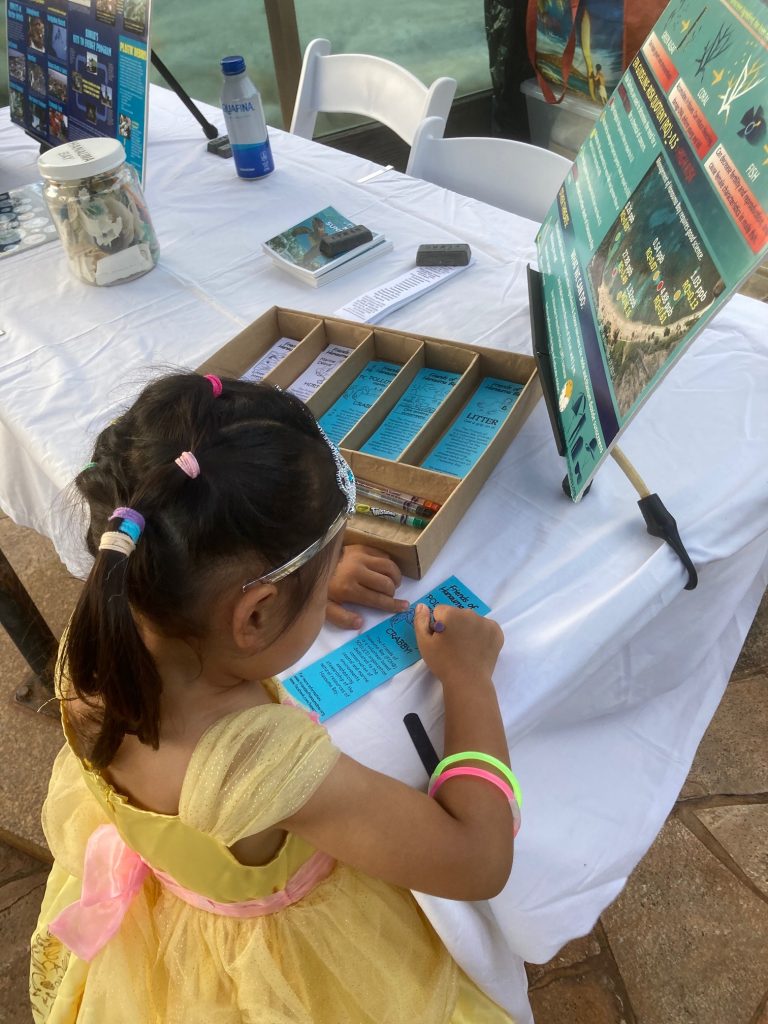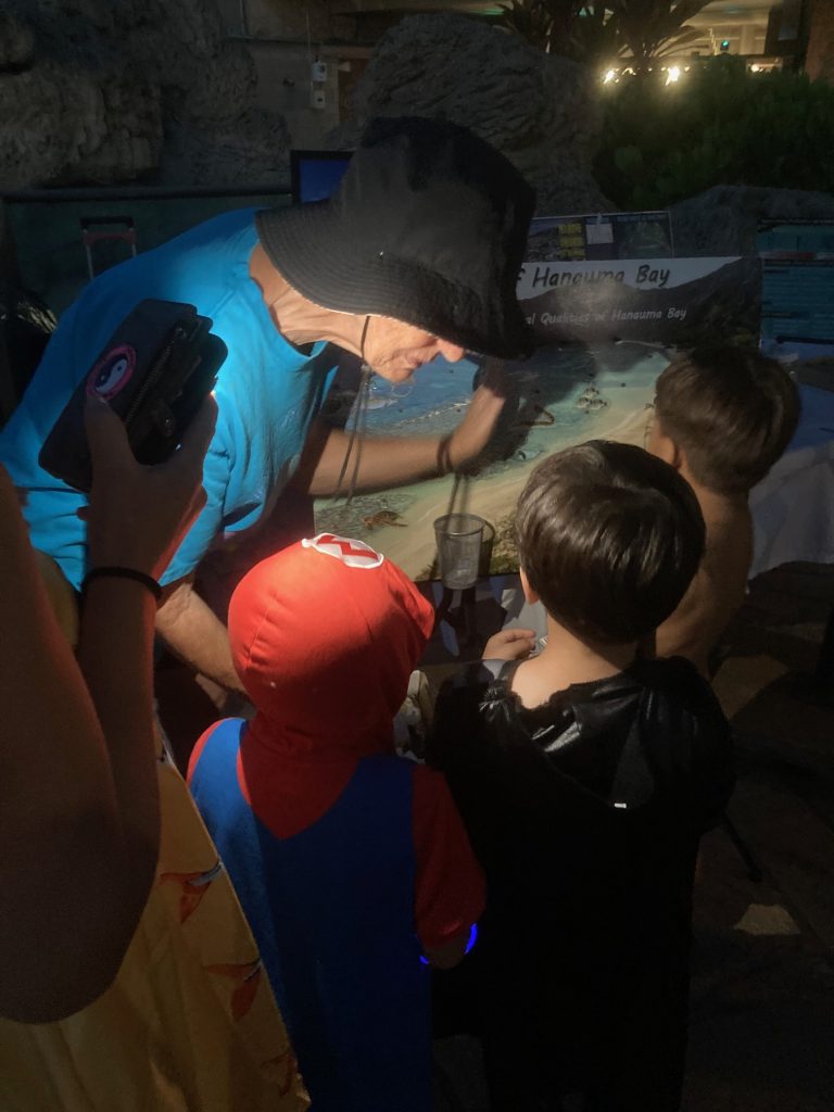 Friday, October 11th , Friends of Hanauma Bay participated in the Waikiki Aquarium Members’ Night. This three-hour event featured games, educational activities in the classroom, a scavenger hunt in the aquarium, underwater pumpkin carving in the shark tank and a Halloween costume contest. FOHB provided informational displays on sunscreen and pollution but also child centered activities of coloring ocean themed bookmarks and playing the habitat game.