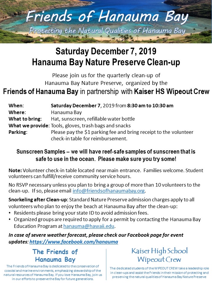 See details below for our December 7 Quarterly Clean-up at Hanauma Bay.