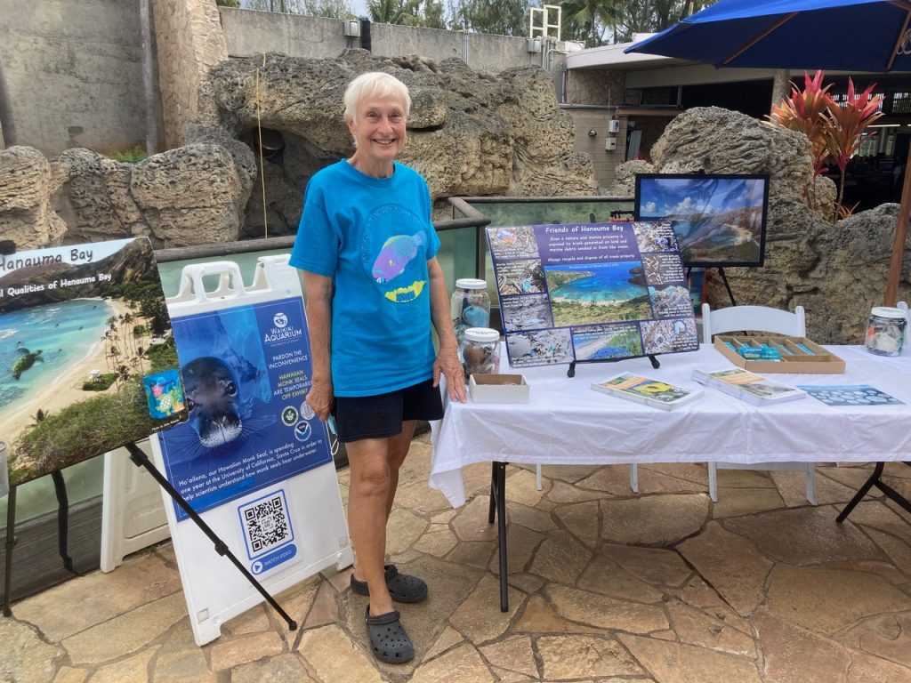 Situated on the top level by the monk seal enclosure, FOHB had a two-table showcase for information on mineral sunscreen, environmental pollution and the timeline for its decomposition, two booklets on backyard conservation, child-friendly colorable bookmarks, and the habitat game for marine animals. Families would stop and explore the various items and/or activities while they were educated on FOHB and its objectives and missions. Residents were asked about their visits to the bay, and they were strongly encouraged to come and visit Hanauma Bay.